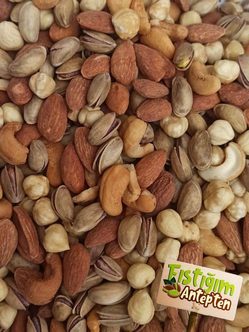 Karışım içinde kavrulmuş Antep fıstığı, kavrulmuş badem, kavrulmuş kaju, kavrulmuş fındık bulunmaktadır.